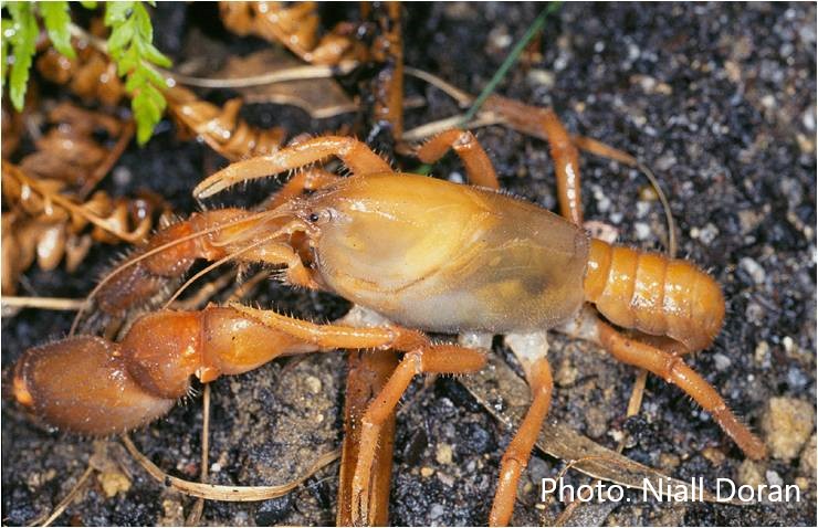The Mt Arthur Burrowing Crayfish (Engaeus orramakunna) is a medium-sized burrowing crayfish growing to a length of about 8 cm. The species is among the most terrestrial of the burrowing crayfish in Tasmania. Animals are usually a striking orange in colour but can also be brown. The Mt Arthur Burrowing Crayfish is known from a range of approximately 300 square km centred on Mt. Arthur in north-east Tasmania. The species extends to near Lilydale, Nabowla and South Springfield, and is also found in the vicinity of Launceston. The Mt Arthur Burrowing Crayfish prefers moist seeps and flat swampy or marshy land feeding into or next to streams and rivers, but can also be found in stream banks, wet pasture, culverts and roadside drains. The principal threats to the species are forestry activities and conversion of habitat to pasture.